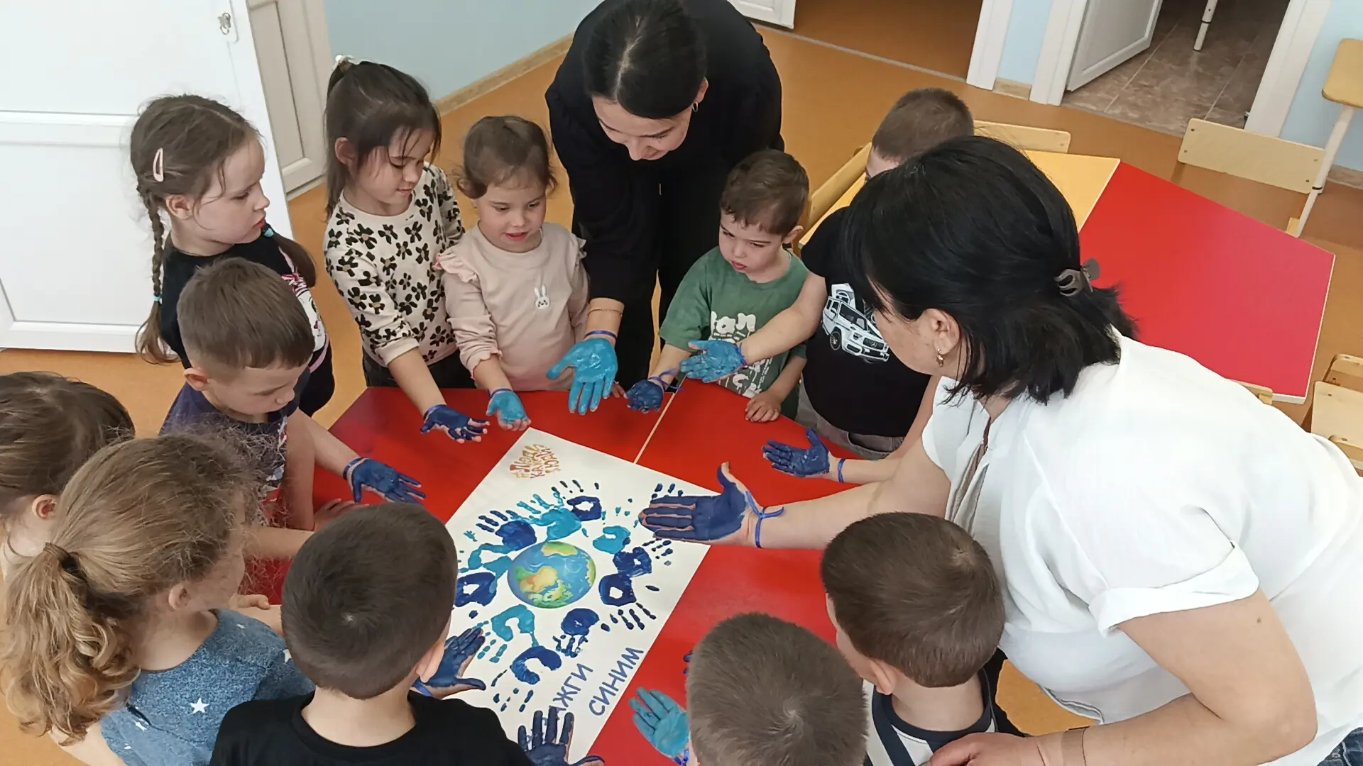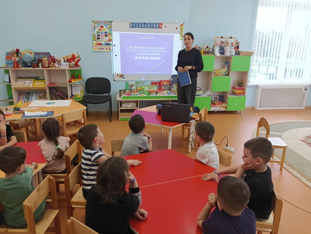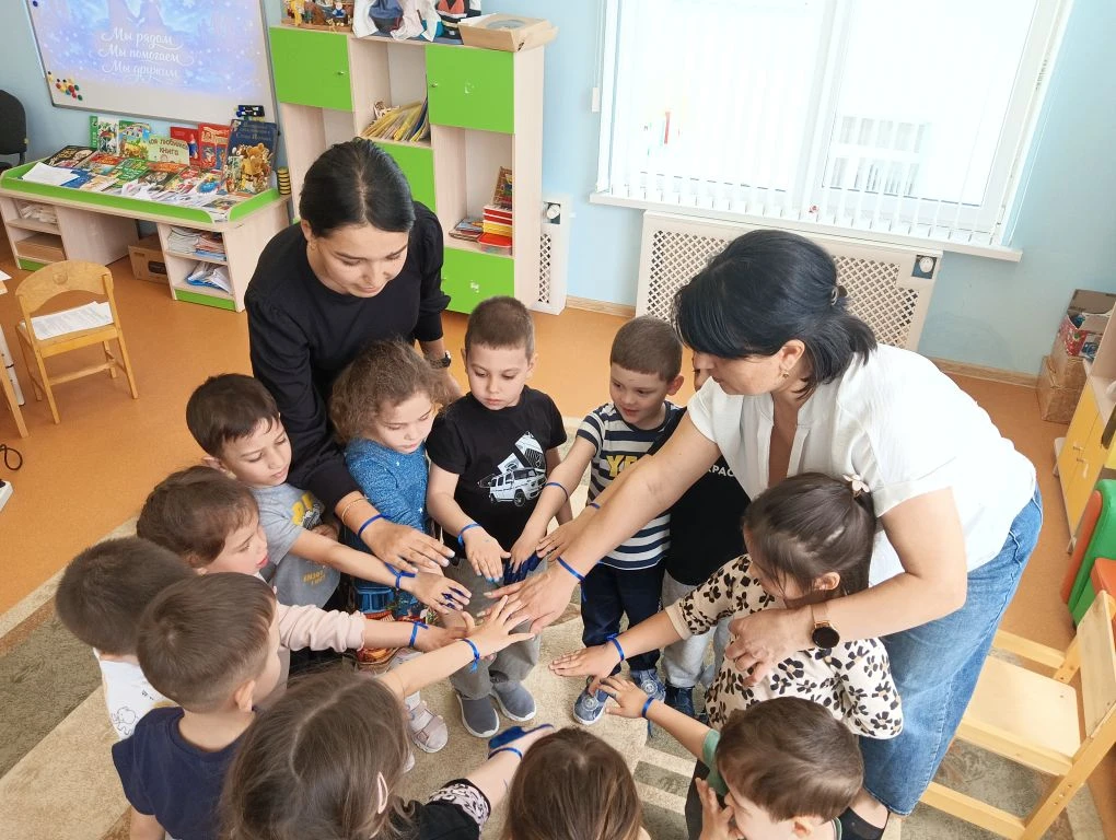 2 апреля отмечается Всемирный день распространения информации о проблеме аутизма. В этот день педагогом-психологом Аблямитовой Зариной Расимовной было проведено тематическое занятие в старшей группе, направленное на воспитание толерантности, дружелюбия и понимания различий между людьми. В доступной форме педагог рассказала ребятам о том, что все люди разные, но равные, и почему важно быть внимательными и добрыми друг к другу. На занятии дети завязали на руку синие ленты — символ поддержки и солидарности; посмотрели познавательный мультфильм об аутизме; создали свою инсталляцию «Зажги синим»: оставили отпечатки ладошек синего цвета.