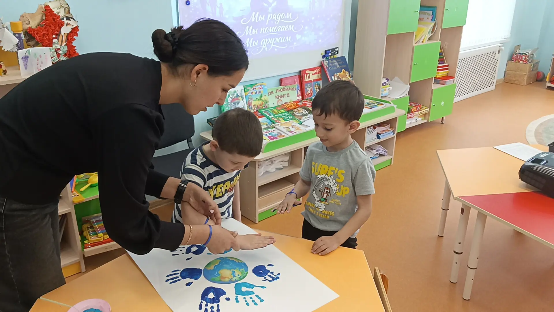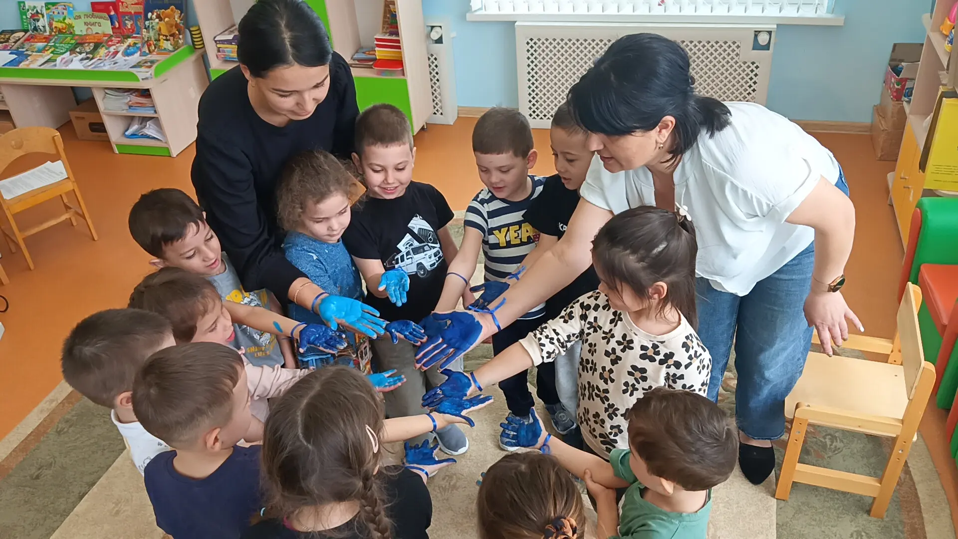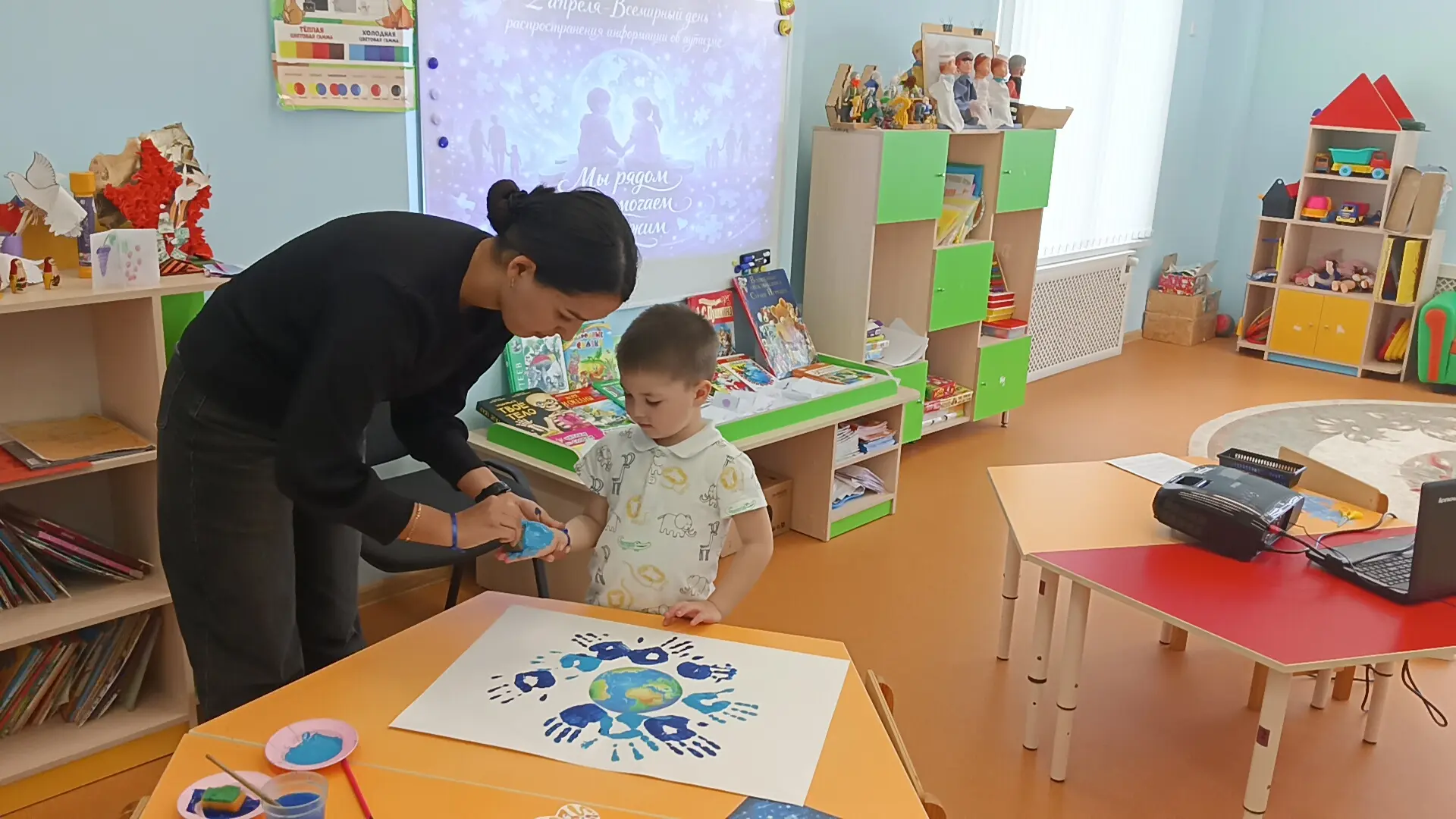 2 апреля отмечается Всемирный день распространения информации о проблеме аутизма. В этот день педагогом-психологом Аблямитовой Зариной Расимовной было проведено тематическое занятие в старшей группе, направленное на воспитание толерантности, дружелюбия и понимания различий между людьми. В доступной форме педагог рассказала ребятам о том, что все люди разные, но равные, и почему важно быть внимательными и добрыми друг к другу. На занятии дети завязали на руку синие ленты — символ поддержки и солидарности; посмотрели познавательный мультфильм об аутизме; создали свою инсталляцию «Зажги синим»: оставили отпечатки ладошек синего цвета.