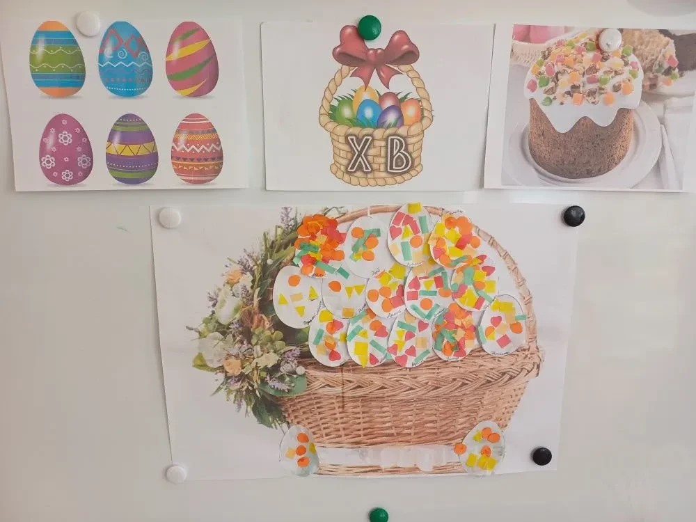 После познавательной беседы ребята с большим энтузиазмом приступили к созданию коллективной аппликации «Пасхальная корзина». Вкладывая частичку своей души в общую работу, они с гордостью украшали корзину яркими яйцами.